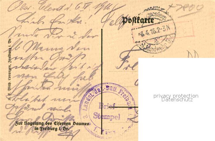 42879196 alte Postkarte Freiburg Breisgau Zur Erinnerung des Eisernen Baumes postalisch gelaufen Feldpost Erhaltung siehe scans [NatalD47] KatCode: 11110008311000