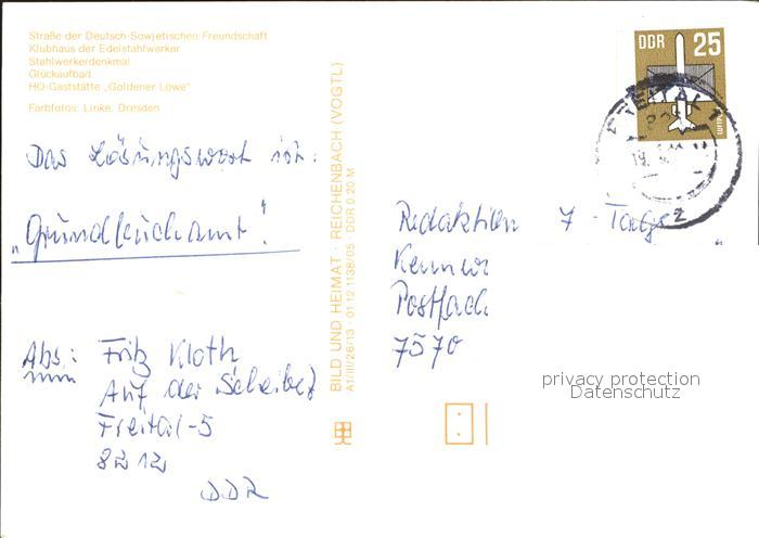 72379227 alte Postkarte Freital Klubhaus Edelstahlwerker Glueckaufbad Stahlwerkerdenkmal postalisch gelaufen Erhaltung siehe scans KatCode: 11110014290130