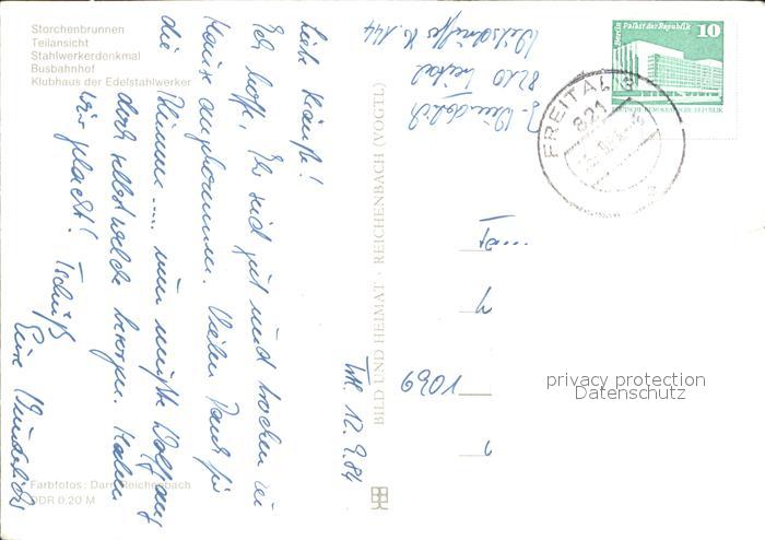 72393518 alte Postkarte Freital Storchenbrunnen Stahlwerkerdenkmal Busbahnhof postalisch gelaufen Erhaltung siehe scans KatCode: 11110014290130