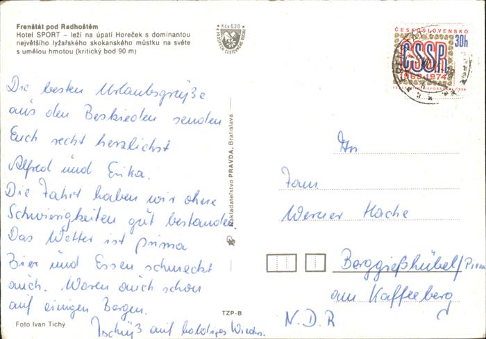 old postcard Frenstat pod Radhostem Hotel Sport postalisch gelaufen Erhaltung siehe scans
