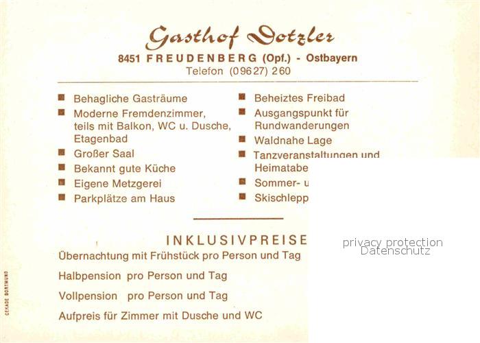 72709466 Freudenberg Oberpfalz Gasthof Dotzler Wandern Freibad Kirche postalisch nicht gelaufen Werbekarte (keine Postkarte) Erhaltung siehe scans [FriedD77] KatCode: 11110009371122
