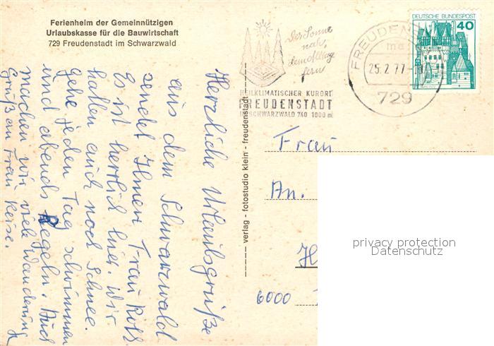 73097846 alte Postkarte FREUDENSTADT BW Ferienheim der Gemeinnuetzigen Urlaubskasse fuer die Bauwirtschaft postalisch gelaufen Erhaltung siehe scans [WerneD78] KatCode: 11110008237028