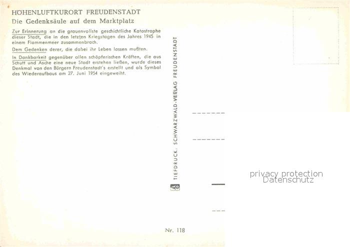 72885687 FREUDENSTADT BW Gedenksaeule Marktplatz Luftkurort im Schwarzwald postalisch nicht gelaufen Erhaltung siehe scans [FriedD77] KatCode: 11110008237028
