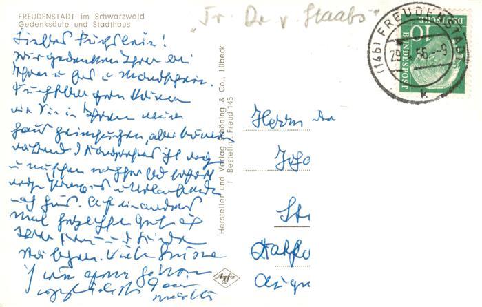 73897748 FREUDENSTADT BW Gedenksaeule und Stadthaus postalisch gelaufen Erhaltung siehe scans [WerneD78] alte Postkarte Wern Katcode 11110008237028