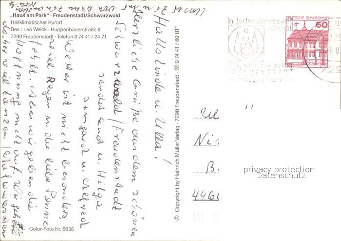 72244006 alte Postkarte FREUDENSTADT BW Haus am Park postalisch gelaufen Erhaltung siehe scans KatCode: 11110008237028