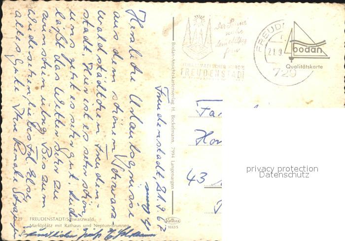 72526519 alte Postkarte FREUDENSTADT BW Marktplatz Rathaus Neptun-Brunnen postalisch gelaufen Erhaltung siehe scans KatCode: 11110008237028