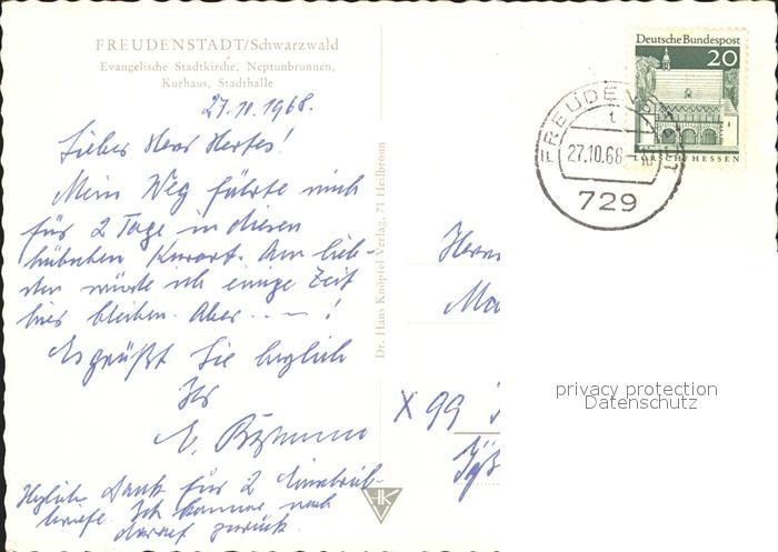72333138 alte Postkarte FREUDENSTADT BW Neptunbrunnen Stadtkirche Kurhaus Stadthalle postalisch gelaufen Erhaltung siehe scans KatCode: 11110008237028