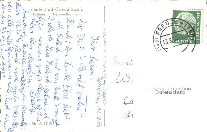 72594787 alte Postkarte FREUDENSTADT BW Rathaus mit Neptun Brunnen postalisch gelaufen Erhaltung siehe scans [WerneD78] KatCode: 11110008237028