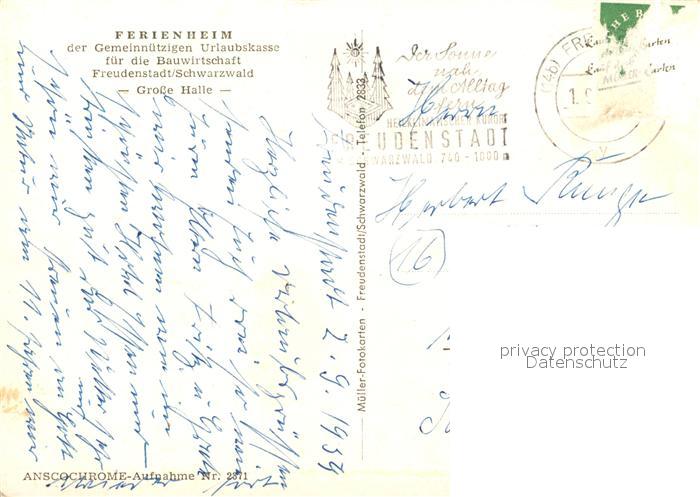 73271697 alte Postkarte Freudenstadt Ferienheim gemeinnuetzige Urlaubskasse Bauwirtschaft Grosse Halle postalisch gelaufen Erhaltung siehe scans [KathaD81] KatCode: 11110008237028