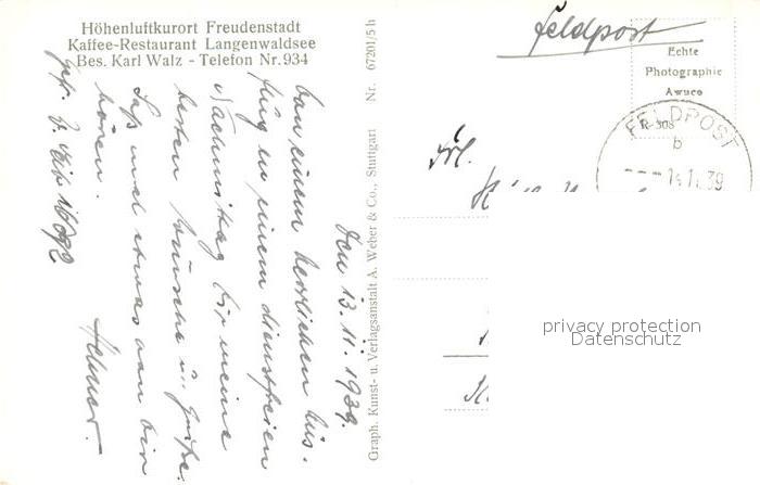 73301115 alte Postkarte Freudenstadt Kaffee-Restaurant Langenwaldsee NZ3 postalisch gelaufen Feldpost Erhaltung siehe scans [PaolaD17] KatCode: 11110008237028