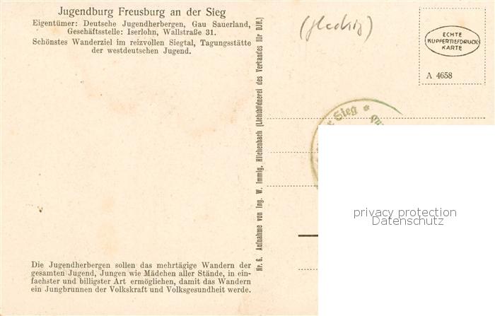 73800871 alte Postkarte Freusburg Kirchen Sieg Jugendburg Freusburg an der Sieg Haus Schlossgarten mit Fluegelanbau postalisch gelaufen Erhaltung siehe scans [WerneD78] KatCode: 11110007132063