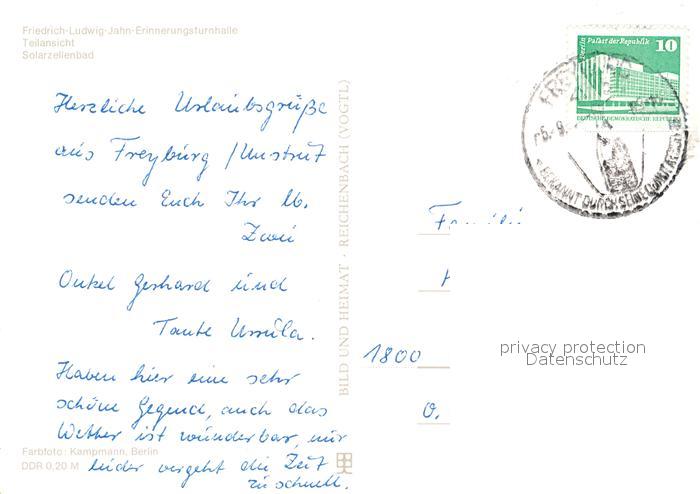 73125111 alte Postkarte Freyburg Unstrut Friedrich-Ludwig-Jahn-Erinnerungsturnhalle Solarzellenbad postalisch gelaufen Erhaltung siehe scans [PaolaD17] KatCode: 11110015084135