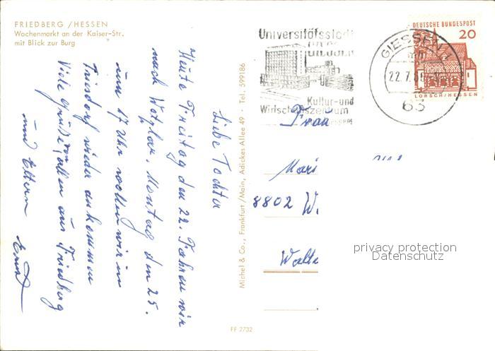 72022286 alte Postkarte Friedberg Hessen Wochenmarkt an der Kaiserstrasse postalisch gelaufen Erhaltung siehe scans KatCode: 11110006440008