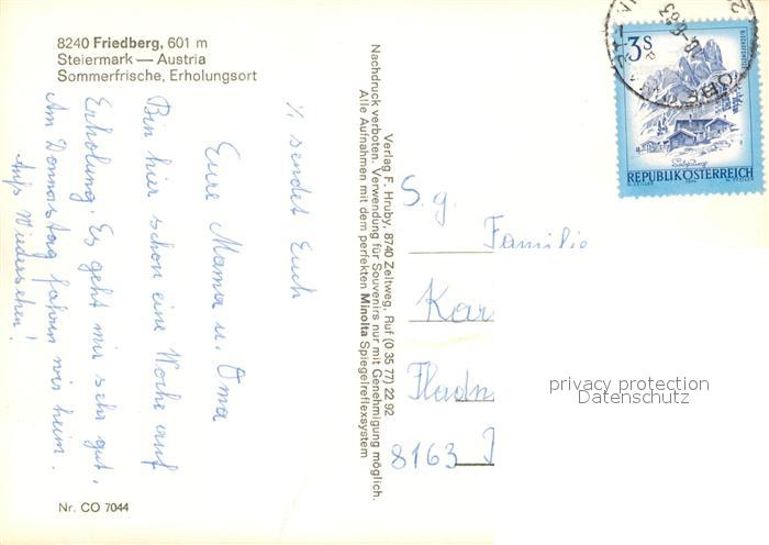 73515896 alte Postkarte Friedberg Steiermark Sommerfrische Erholungsort Fliegeraufnahme postalisch gelaufen Erhaltung siehe scans [FriedD77] KatCode: 11390224060706