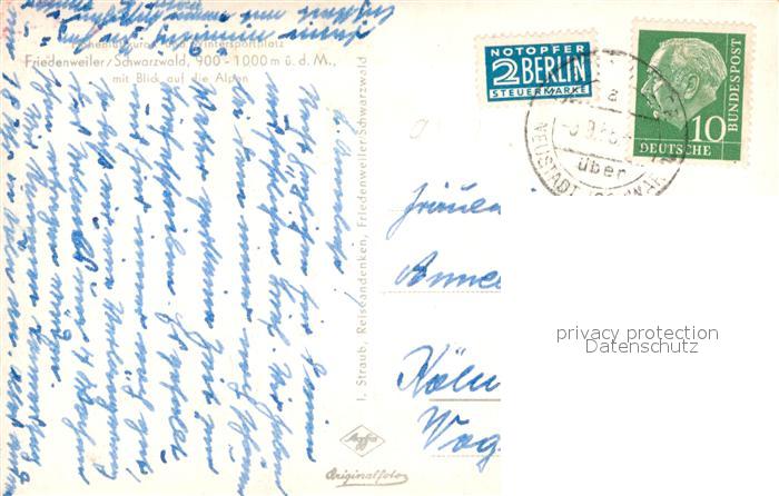 72978038 alte Postkarte Friedenweiler Gesamtansicht Luftkurort Schwarzwald mit Alpenkette postalisch gelaufen Erhaltung siehe scans [FriedD77] KatCode: 11110008315039