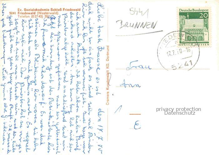 74050405 alte Postkarte Friedewald Westerwald Schloss Friedewald Brunnen postalisch gelaufen Erhaltung siehe scans [WerneD78] KatCode: 11110007132036