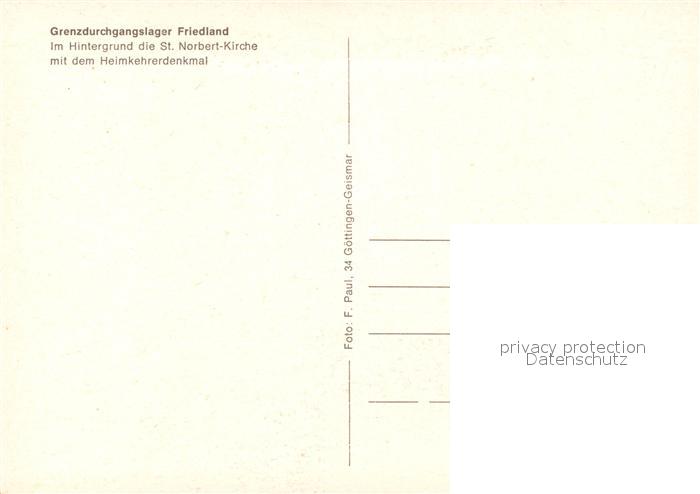 73064631 Friedland Goettingen Grenzdurchgangslager St Norbert Kirche Heimkehrerdenkmal postalisch nicht gelaufen Erhaltung siehe scans [FriedD77] KatCode: 11110003152009