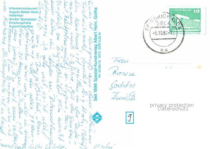 72845212 alte Postkarte Friedrichroda FDGB-Erholungsheim August Bebel postalisch gelaufen Erhaltung siehe scans [PaolaD17] KatCode: 11110016067019
