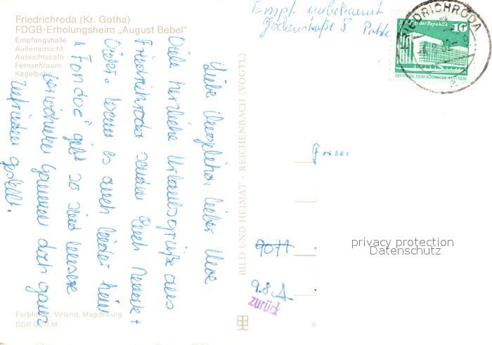 73685005 alte Postkarte Friedrichroda FDGB Erholungsheim August Bebel Empfangshalle Cafe Fernsehraum Kegelbahn postalisch gelaufen Erhaltung siehe scans [FriedD77] KatCode: 11110016067019