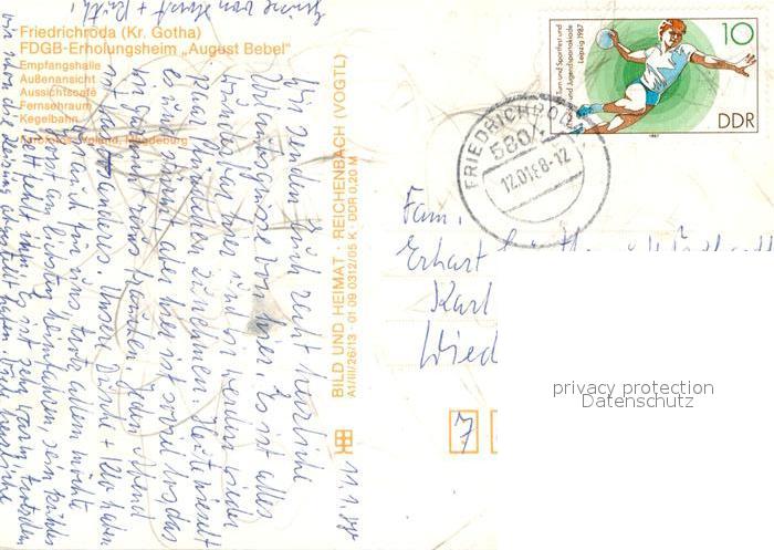 72989729 alte Postkarte Friedrichroda FDGB Erholungsheim August Bebel Empfangshalle Fernsehraum Kegelbahn postalisch gelaufen Erhaltung siehe scans [WerneD78] KatCode: 11110016067019