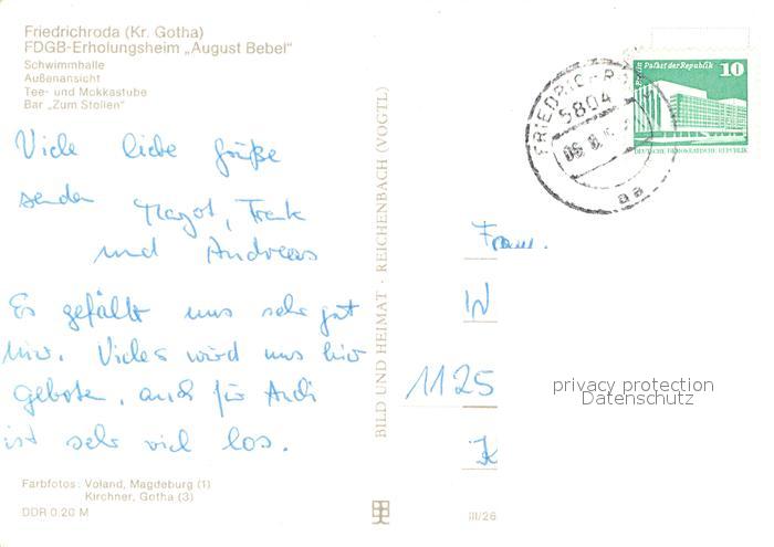 73741335 alte Postkarte Friedrichroda FDGB Erholungsheim August Bebel Schwimmhalle Tee und Mokkastube Bar Zum Stollen postalisch gelaufen Erhaltung siehe scans [FriedD77] KatCode: 11110016067019