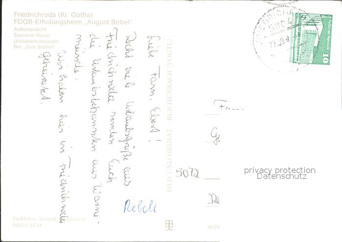 72373065 alte Postkarte Friedrichroda FDGB Erholungsheim August Bebel Souvenir Basar Restaurant Bar postalisch gelaufen Erhaltung siehe scans KatCode: 11110016067019