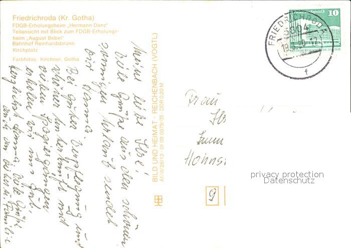 72422002 alte Postkarte Friedrichroda FDGB Erholungsheim Hermann Danz August Bebel Bahnhof Reinhardsbrunn Kirchplatz postalisch gelaufen Erhaltung siehe scans KatCode: 11110016067019