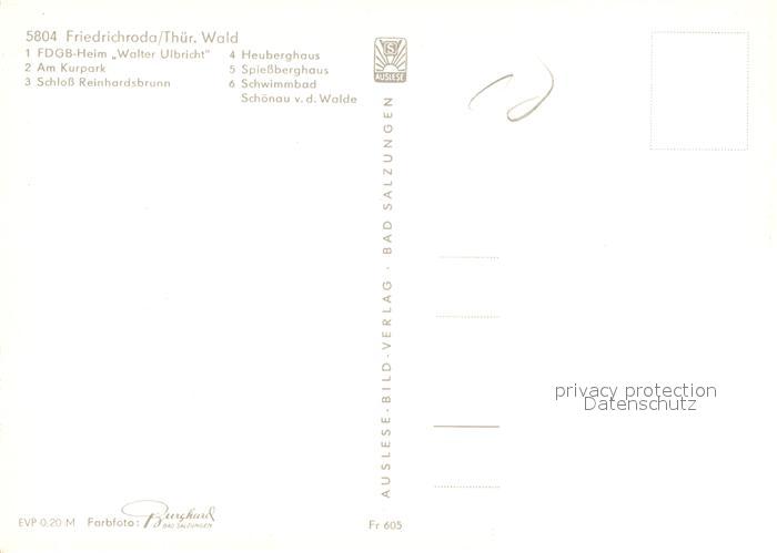 73015365 Friedrichroda FDGB Erholungsheim Walter Ulbricht Kurpark Schloss Reinhardsbrunn Heuberghaus Spiessberghaus Schwimmbad Schoenau postalisch nicht gelaufen Erhaltung siehe scans [WerneD78] KatCode: 11110016067019