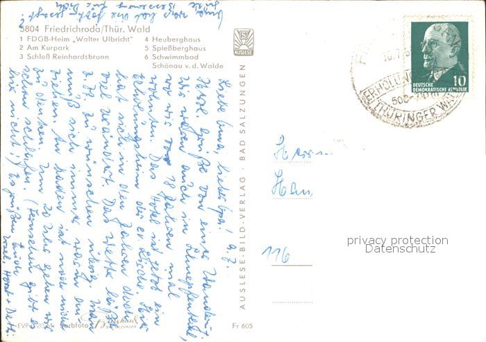 72279790 alte Postkarte Friedrichroda FDGB Heim Walter Ulbricht Kurpark Schloss Reinhardsbrunn Heuberghaus Spiessberghaus Schwimmbad Luftkurort postalisch gelaufen Erhaltung siehe scans KatCode: 11110016067019