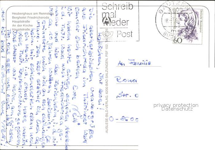 72337009 alte Postkarte Friedrichroda Heuberghaus am Rennsteig Berghotel Hauptstrasse Kirche postalisch gelaufen Erhaltung siehe scans KatCode: 11110016067019