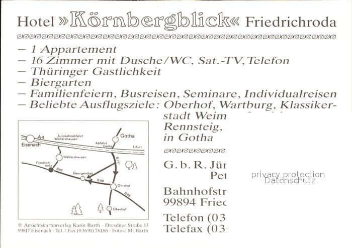 72449601 Friedrichroda Hotel Restaurant Biergarten Koernbergblick postalisch nicht gelaufen Werbekarte (keine Postkarte) Erhaltung siehe scans KatCode: 11110016067019