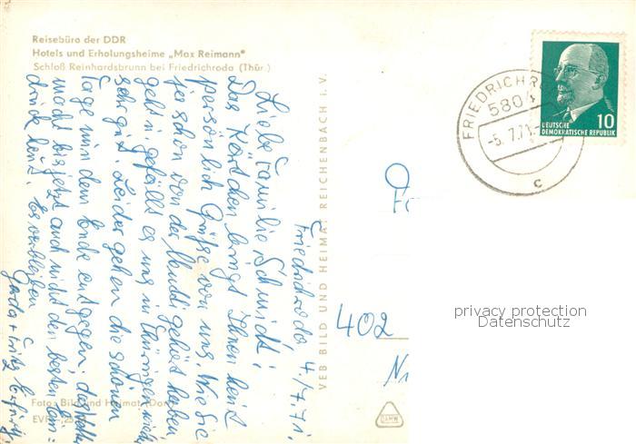73765043 alte Postkarte Friedrichroda Hotels und Erholungsheime Max Reimann Schloss Reinhardsbrunn postalisch gelaufen Erhaltung siehe scans [WerneD78] KatCode: 11110016067019