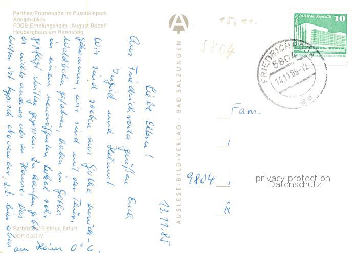73026507 alte Postkarte Friedrichroda Perthes Promenade Puschkinpark Adolphsblick postalisch gelaufen Erhaltung siehe scans [KathaD81] KatCode: 11110016067019