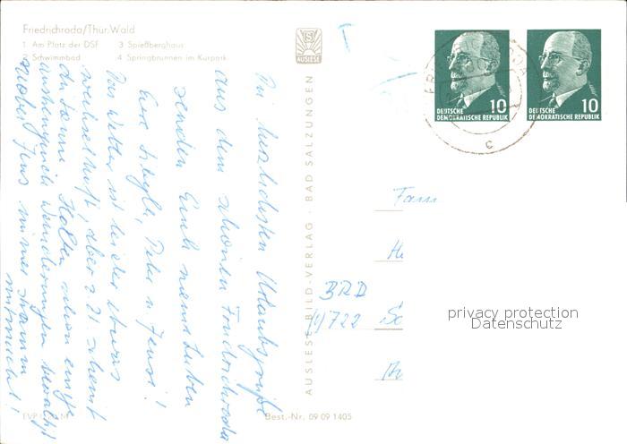 72223211 alte Postkarte Friedrichroda Platz DSF Spiessberghaus Schwimmbad postalisch gelaufen Erhaltung siehe scans KatCode: 11110016067019