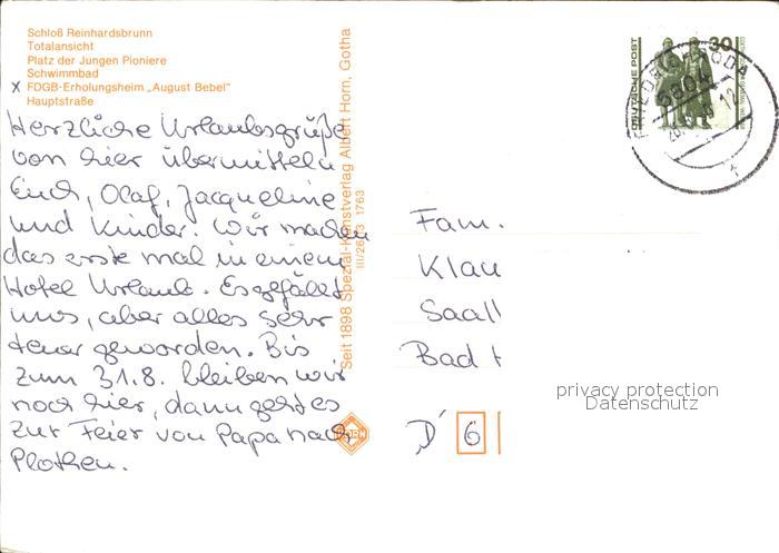 72596561 alte Postkarte Friedrichroda Schloss Reinhardsbrunn Platz der Jungen Pioniere Schwimmbad FDGB Erholungsheim Hauptstrasse Herz postalisch gelaufen Erhaltung siehe scans [FriedD77] KatCode: 11110016067019