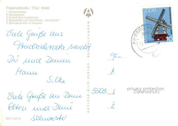 73067358 alte Postkarte Friedrichroda Schwimmbad Gondelteich Schloss Reinhardsbrunn Gaststaette Tanzbuche Springbrunnen Kurpark postalisch gelaufen Erhaltung siehe scans [WerneD78] KatCode: 11110016067019