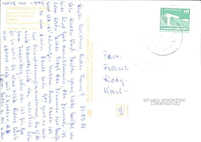 72418366 alte Postkarte Friedrichroda Teilansicht Blick vom Kirchturm Waldbad Platz der Opfer des Faschismus postalisch gelaufen Erhaltung siehe scans KatCode: 11110016067019