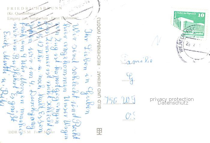 72940727 alte Postkarte Friedrichsbrunn Harz Eingang zum Sanatorium Ernst Thaelmann postalisch gelaufen Erhaltung siehe scans [FriedD77] KatCode: 11110015085115