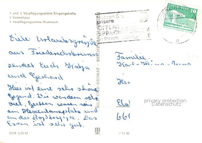 73723035 alte Postkarte Friedrichsbrunn Harz FDGB Erholungsheim Kurt Dillge Verpflegungsstaette Eingangshalle Bettenhaus Klubraum postalisch gelaufen Erhaltung siehe scans [WerneD78] KatCode: 11110015085115