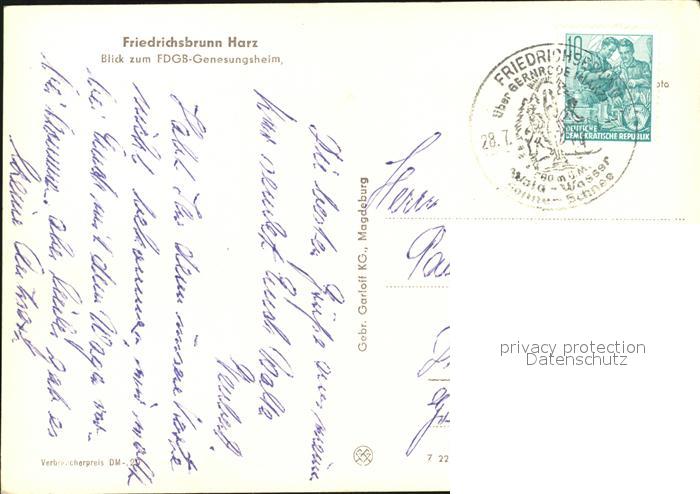 72401385 alte Postkarte Friedrichsbrunn Harz FDGB-Genesungsheim postalisch gelaufen Erhaltung siehe scans KatCode: 11110015085115