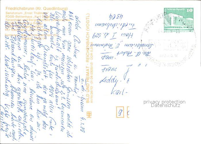72419015 alte Postkarte Friedrichsbrunn Harz Thaelmann Sanatorium FDGB Ferienheime Kurt Dillge und Viktorshoehe Klobenberg Baude FDGB Verpflegungsstaette HOG Zum Pamberg postalisch gelaufen Erhaltung siehe scans KatCode: 11110015085115