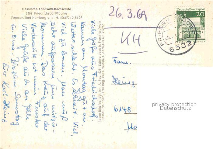 72831922 alte Postkarte Friedrichsdorf Taunus Hessische Landvolk Hochschule Fliegeraufnahme postalisch gelaufen Erhaltung siehe scans [FriedD77] KatCode: 11110006434002