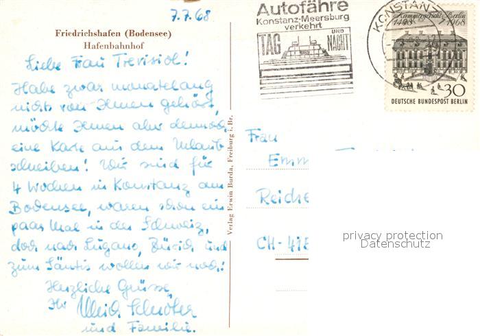 73293689 alte Postkarte Friedrichshafen Bodensee Hafenbahnhof Faehren Ansicht vom See aus postalisch gelaufen Erhaltung siehe scans [FriedD77] KatCode: 11110008435016