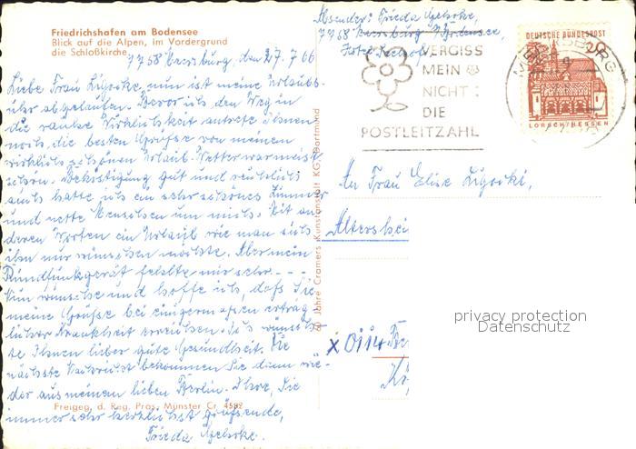 71947273 alte Postkarte Friedrichshafen Bodensee Schlosskirche Alpen Fliegeraufnahme postalisch gelaufen KatCode: 11110008435016