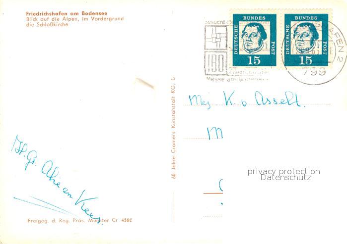 72935679 alte Postkarte Friedrichshafen Bodensee Schlosskirche Blick auf die Alpen Fliegeraufnahme postalisch gelaufen Erhaltung siehe scans [FriedD77] KatCode: 11110008435016
