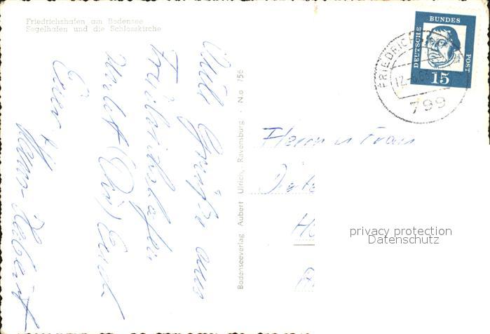 72527286 alte Postkarte Friedrichshafen Bodensee Segelhafen und Schlosskirche postalisch gelaufen Erhaltung siehe scans KatCode: 11110008435016