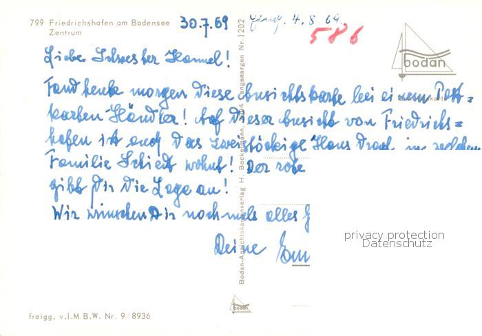 73755556 alte Postkarte Friedrichshafen Bodensee Zentrum Alpenkette postalisch gelaufen Fliegeraufnahme Erhaltung siehe scans [FriedD77] KatCode: 11110008435016