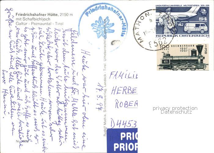 72536521 alte Postkarte Friedrichshafener Huette mit Schafbichljoch Galtuer Paznauntal postalisch gelaufen Erhaltung siehe scans [WerneD78 kt117box] KatCode: 11390