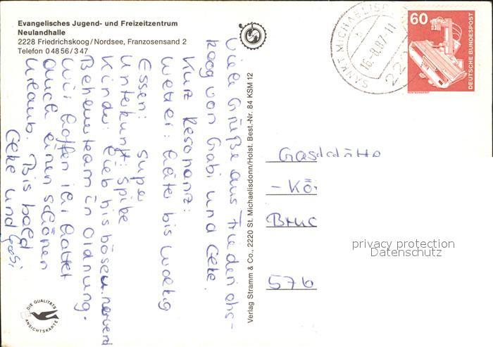 72577782 alte Postkarte Friedrichskoog Nordseebad Ev Jugend und Freizeitzentrum Neulandhalle Ferienhaeuser postalisch gelaufen Erhaltung siehe scans [FriedD77] KatCode: 11110001051034