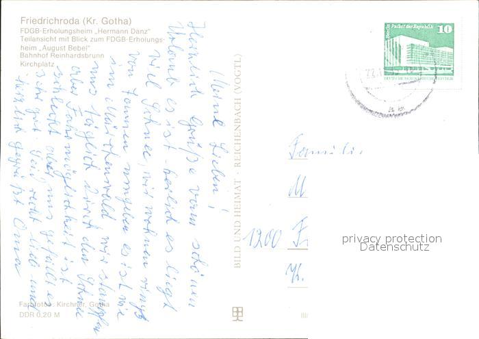 72263531 alte Postkarte Friedrichsroda Erholungsheime Hermann Danz und August Bebel Bahnhof-Rheinhardsbrunn Kirchplatz postalisch gelaufen Erhaltung siehe scans KatCode: 11110016067029